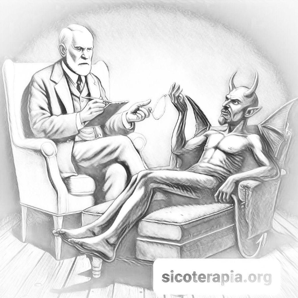 The image of Sigmund Freud conducting psychoanalytic therapy with the Devil is an intriguing concept that combines psychoanalytic themes with symbolic mythology.