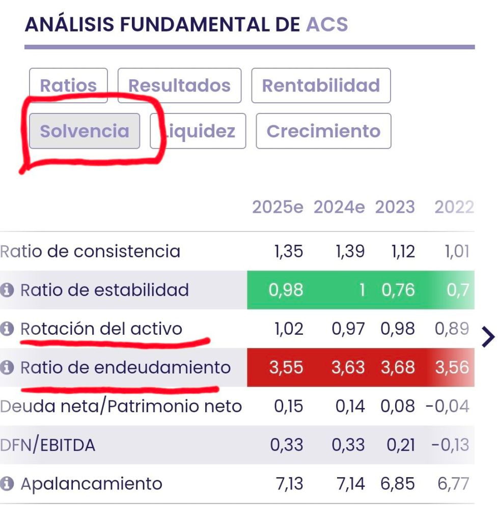 La empresa ACS tiene una solvencia negativa según el siguiente gráfico publicado por EI Estrategia de Inversión, con un ratio de endeudamiento en rojo de un 3,55 % superior al capital, con un índice de estabilidad de solo un 0,98 %. Según el gráfico no tiene solvencia económica.