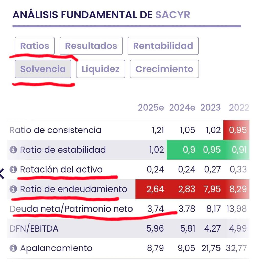 Los números rojos también afectan a la segunda empresa rescatada por Gabriel Boric, se trata de la española SACYR, que tiene un ratio de endeudamiento de 3,74 % sobre el activo, según el gráfico publicado en la web citada:
