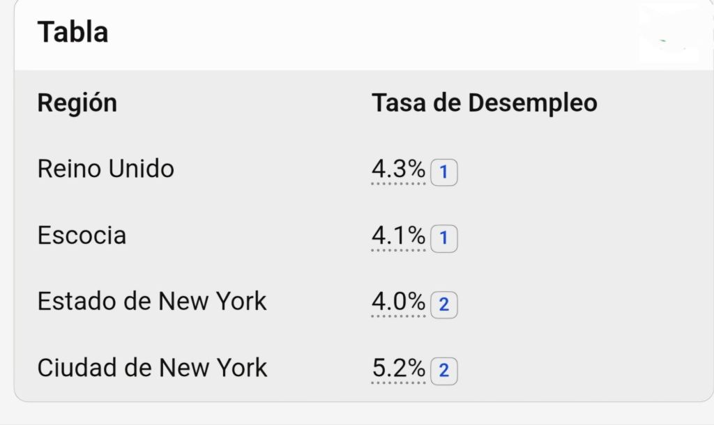 Tasas de desempleo en Reino Unido, Escocia, Estado de New York y New York City.