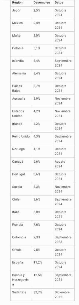 Tasas de desempleo de Japón, México, Malta, Polonia, Islandia, Alemania, Países Bajos, Australia, Estados Unidos, Irlanda, Noruega, Canadá, Portugal, Suecia, Chile, Italia, Francia, Grecia, España, Bosnia y Herzegobina y Sudáfrica.