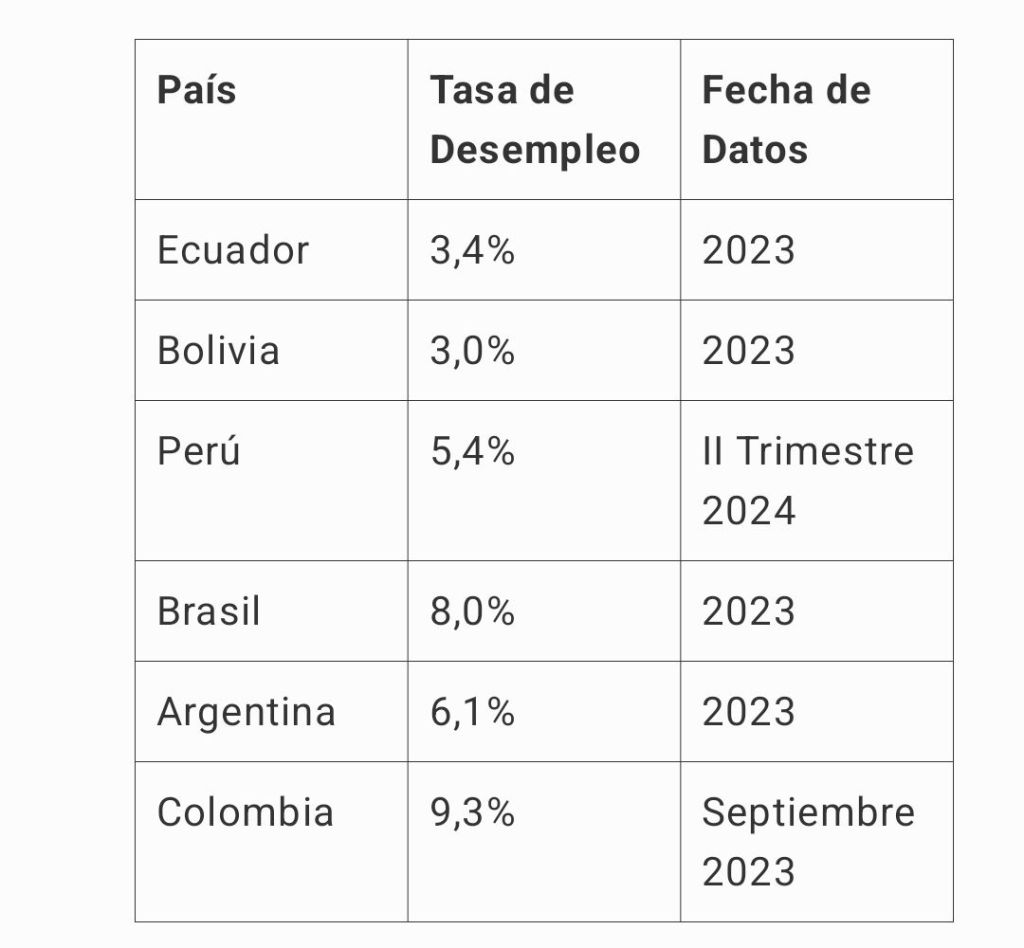 Tasas de desempleo de Ecuador, Bolivia, Perú, Brasil, Argentina y Colombia.