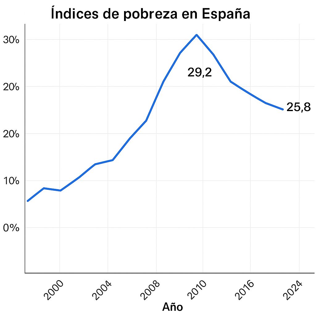 Aquí tienes una visión general de los índices de pobreza en España entre 2000 y 2024, basados principalmente en la tasa AROPE (At Risk Of Poverty or Social Exclusion), el indicador oficial de la Unión Europea que combina tres factores: riesgo de pobreza, carencia material severa y baja intensidad en el empleo.